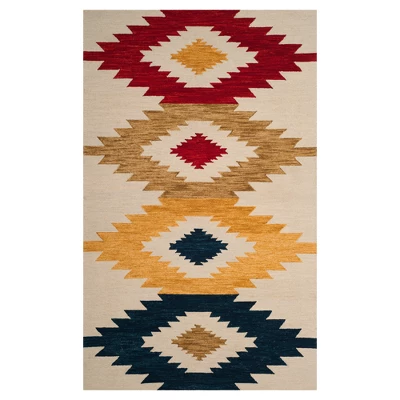 The trendy new look of rustic chic decor is marvelously captured in the native-art inspired designs and sublime color palette of the Holden Collection. Simple yet expressive, Holden revives geometric motifs with fashionable hues and a comfort-soft feel underfoot. The bright and eye catching of these rugs are cheerful and create a fun, airy atmosphere in the room. Made using pure wool in a low loop pile, this striking collection is perfectly styled for classy-casual home decor.